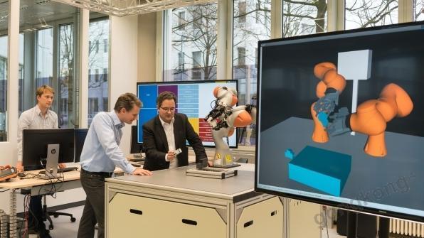 西門子——西門子中央研究院近日在慕尼黑演示了雙臂機(jī)器人的一部分,借助人工智能的高度自動化,該機(jī)器人無需編程即可自主分工協(xié)作,用于產(chǎn)品制造。西門子中央研究院Kai Wurm博士表示,“我們只需告訴機(jī)器人,把某個部件安裝到導(dǎo)軌上,它就會執(zhí)行這個操作。”作為一個簡化的例子,這項任務(wù)描述了“單件定制化生產(chǎn)”的內(nèi)涵。其中涉及加工或組裝含有不同部件的多樣化產(chǎn)品。機(jī)器人從關(guān)聯(lián)的軟件模型中獲取制造產(chǎn)品的相關(guān)信息。傳統(tǒng)的機(jī)器人無法理解這種CAD/CAM(計算機(jī)輔助設(shè)計和制造)模型,但新的機(jī)器人原型可以做到。從某種意義上說,這就好像機(jī)器人能夠理解不同的語言,從而不必對其運(yùn)動和工藝進(jìn)行編程。