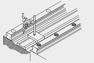 將基準(zhǔn)側(cè)兩個滑塊固定在一個測定平臺上,而從動側(cè)只裝上一個滑塊,其導(dǎo)軌與滑塊都尚未緊固于床臺與平臺,使用附于從動側(cè)滑塊頂面千分量表,量測從動側(cè)滑塊的側(cè)基準(zhǔn)面,從導(dǎo)軌的一端開始校準(zhǔn)并依序以特定的扭力鎖緊裝配螺絲。