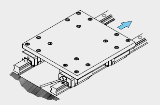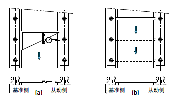 在無固定螺釘?shù)陌惭b例中為確保從動側(cè)導(dǎo)軌與基準(zhǔn)側(cè)導(dǎo)軌間的平行度,導(dǎo)軌可依下列所示安裝,而滑塊的安裝則與前述范例相同。