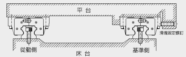 使用兩個(gè)滑塊緊密接合固定于測(cè)定用平板,依床臺(tái)導(dǎo)軌裝配附近的基準(zhǔn)面為準(zhǔn),使用千分量表校準(zhǔn)基準(zhǔn)側(cè)導(dǎo)軌之側(cè)邊基準(zhǔn)面,從導(dǎo)軌的一端開始校準(zhǔn)并依序以特定的扭力鎖緊裝配螺絲。