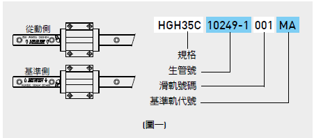 2. 確認(rèn)基準(zhǔn)軌與從動(dòng)軌:當(dāng)非互換型直線導(dǎo)軌配對(duì)使用時(shí),需注意基準(zhǔn)軌與從動(dòng)軌之差異。基準(zhǔn)軌側(cè)邊基準(zhǔn)面精度較從動(dòng)軌高,可作為床臺(tái)安裝承靠面。基準(zhǔn)軌上有刻上MA之記號(hào)。而且,雙軌配對(duì)使用時(shí),基準(zhǔn)軌編號(hào)為奇數(shù),而從動(dòng)軌之導(dǎo)軌編號(hào)為偶數(shù),安裝時(shí)請(qǐng)依照符號(hào)的指示,按順序進(jìn)行安裝(例如:001與002配對(duì)、003與004配對(duì)…),如圖一所示。如為多軌安裝,請(qǐng)以此類推。