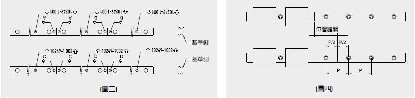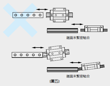 4. 導(dǎo)軌接牙件:導(dǎo)軌接牙安裝時(shí)必須依照導(dǎo)軌上標(biāo)示順序安裝,以確保直線導(dǎo)軌精度。接牙標(biāo)幟在接牙端的上表面,請(qǐng)將相同接牙標(biāo)幟的兩端接在一起,如圖三所示。且建議配對(duì)之導(dǎo)軌接牙位置最好能錯(cuò)開,以避免床臺(tái)至接牙處因不同導(dǎo)軌差異而造成精度不良,如圖四所示。