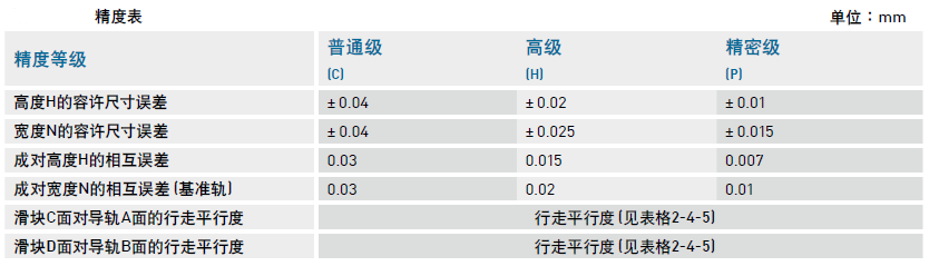 互換性直線導軌精度在滑塊組裝于單支導軌之成對高及寬度精度,同非互換性直線導軌精度,但若組裝于不同支導軌上,因導軌高度誤差,其成對高及寬度精度,比非互換性直線導軌精度稍微遜色,而行走平行度精度則同非互換性直線導軌之精度。
