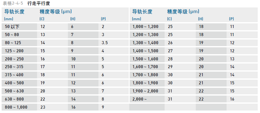 導軌C對A、D對B之行走平行度與導軌精度、長度有關,其值列于下表。