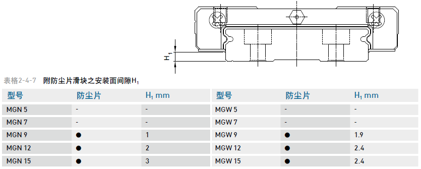 標準防塵配備滑塊兩端裝有刮油片,以阻隔粉塵或雜質進入滑塊內部,而影響直線導軌壽命及精度。防塵片是裝在滑塊底部,以防止粉塵或雜質從滑塊底部間隙進入滑塊內部,客戶若欲選用防塵片,可于型號后面加 +U 代碼。規格5、7滑塊至底部承靠面間隙 (H1) 很小,并不提供加裝防塵片,然規格9、12與15有提供防塵片選用??蛻粼谶x用防塵片時,需注意滑塊間隙 (H1) 變小,當有側邊承靠面使用時,側邊承靠面之高度,不可大于間隙值(H1),以避免滑塊在運行時干涉到側邊承靠面。
