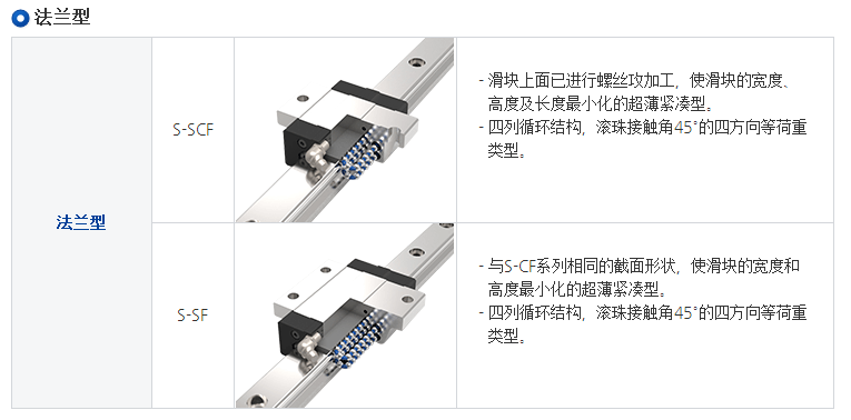 S系列使用四列鋼珠承受負荷設計,使其具備高剛性、高負荷的特性,同時具備四方向等負載特色、及自動調心的功能, 可吸收安裝面的裝配誤差,得到高精度的訴求。 加上降低組合高度及縮短滑塊長度,非常適合高速自動化產業機械及空間要求的小型設備使用。